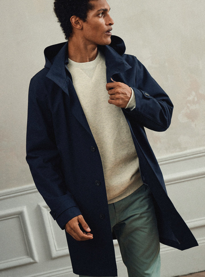 • Imper Travis Navy : Coton déperlant, silhouette affûtée. L’allié des matins pressés et des averses surprises.